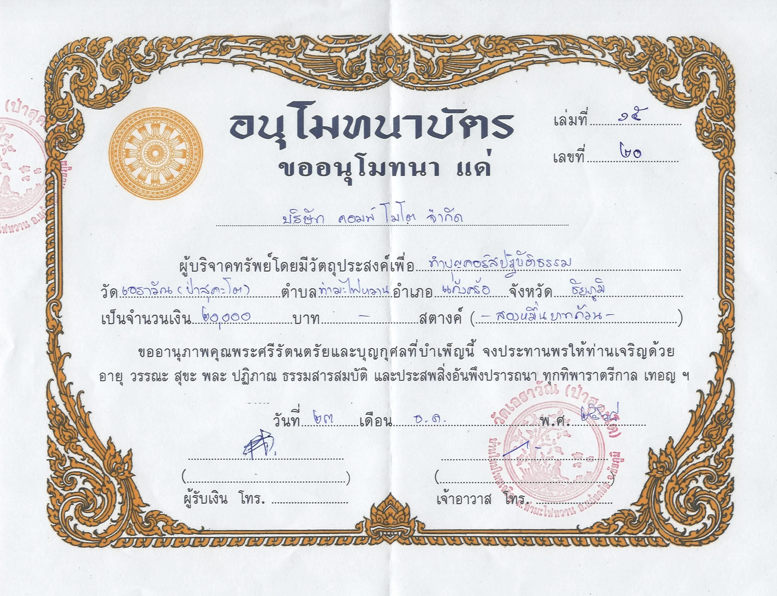 บริษัท คอมพ์ โมโต จำกัด ตระหนักถึงความสำคัญในการเป็นส่วนหนึ่งของการทำนุบำรุงพระพุทธศาสนาอย่างยั่งยืน จึงมีนโยบาย บริจาคปัจจัยสมทบทุนอย่างต่อเนื่องตลอดทั้งปี ให้แก่ศาสนสถานต่างๆ อาทิ วัดเอราวัณ (วัดป่าสุคะโต) ต.ท่ามะไฟหวาน อ.แก้งคร้อ จ.ชัยภูมิ โดยมียอดบริจาครวมหลายรายการ เพื่อสนับสนุนให้ทางวัดมีทรัพยากรเพียงพอในการดำเนินกิจกรรมทางศาสนาและสาธารณสงเคราะห์สืบต่อไป