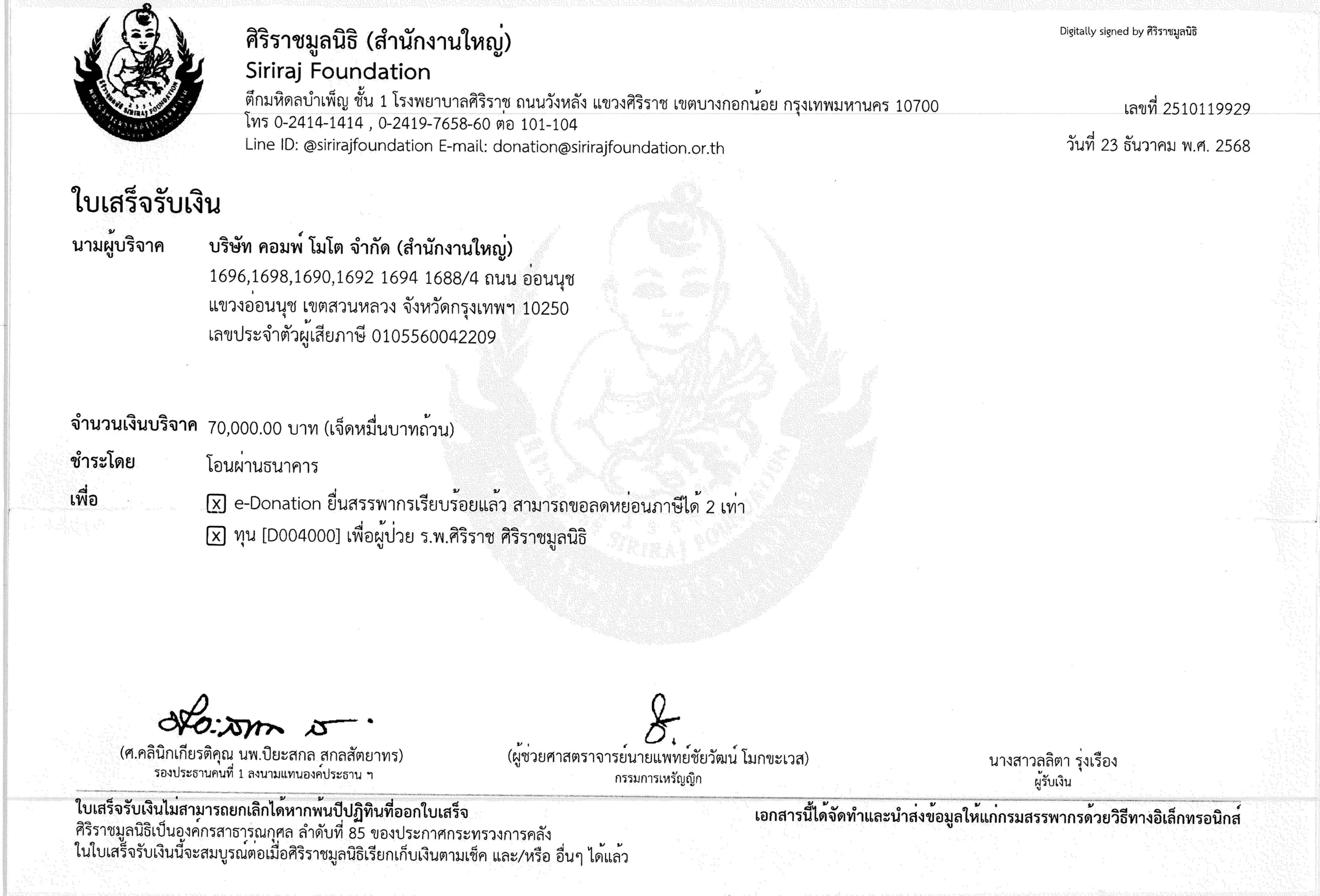 Comp Moto ปันน้ำใจสู่ศิริราชมูลนิธิ เมื่อวันที่ 23 ธันวาคม 2568 บริษัท คอมพ์ โมโต จำกัด ได้ร่วมเป็นส่วนหนึ่งในการช่วยเหลือสังคม โดยมอบเงินบริจาคจำนวน 70,000 บาท ให้แก่ ศิริราชมูลนิธิ (ทุนเพื่อผู้ป่วย รพ.ศิริราช) การบริจาคในครั้งนี้มีวัตถุประสงค์เพื่อสมทบทุนกองทุนช่วยเหลือผู้ป่วยที่ขาดแคลนทุนทรัพย์ รวมถึงสนับสนุนการจัดหาเวชภัณฑ์และอุปกรณ์ทางการแพทย์ เพื่อให้โรงพยาบาลศิริราชสามารถให้การรักษาพยาบาลได้อย่างเต็มประสิทธิภาพต่อไป